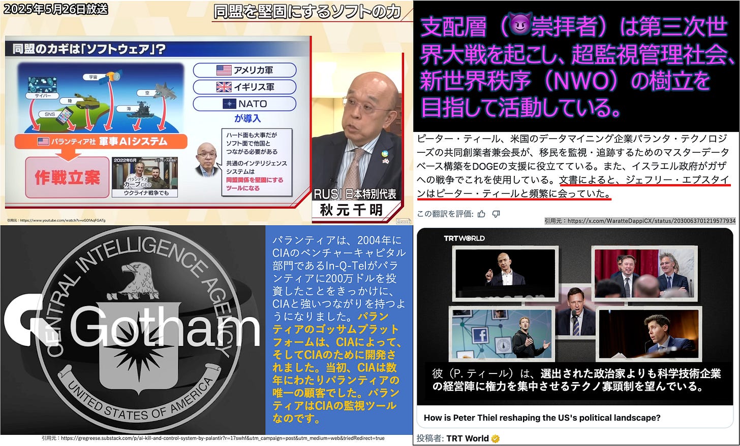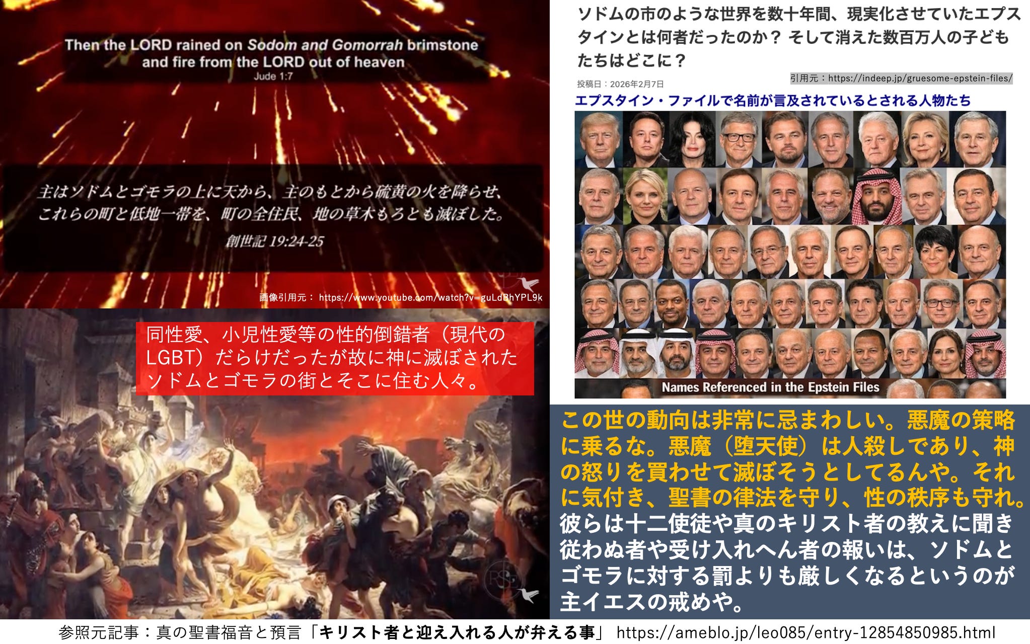 近頃、エプスタイン文書が公開されて、世界的有名人や王族等の人たちが姦淫(不倫)行為だけでなく、小児性愛といった性的倒錯行為や、人肉食、人身御供といった著しく常軌を逸した悍ましい行為を行なっていることが明らかなりました。太陽暦の二千二十六年三月五日には、エプスタインと緊密な関係にあったパランティア・テクノロジーズ創業者のピーター・ティール氏と高市首相が面会し、支配層の人々が監視管理社会の実現を目指している事が露わになりました(参考投稿はこちら、X)。高市首相もこちら(日刊ゲンダイ)のように猥褻な行為を好む人間、神から遠い悪魔崇拝者であることは疑いようがありません。現代の世相は創世記に書かれたソドムとゴモラの情景とそっくりであり、聖書読者なら終末が近いと感じる筈です。